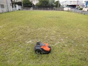 工場の緑地でロボット芝刈り機オートモア550 EPOS短時間のデモランをしてきました。